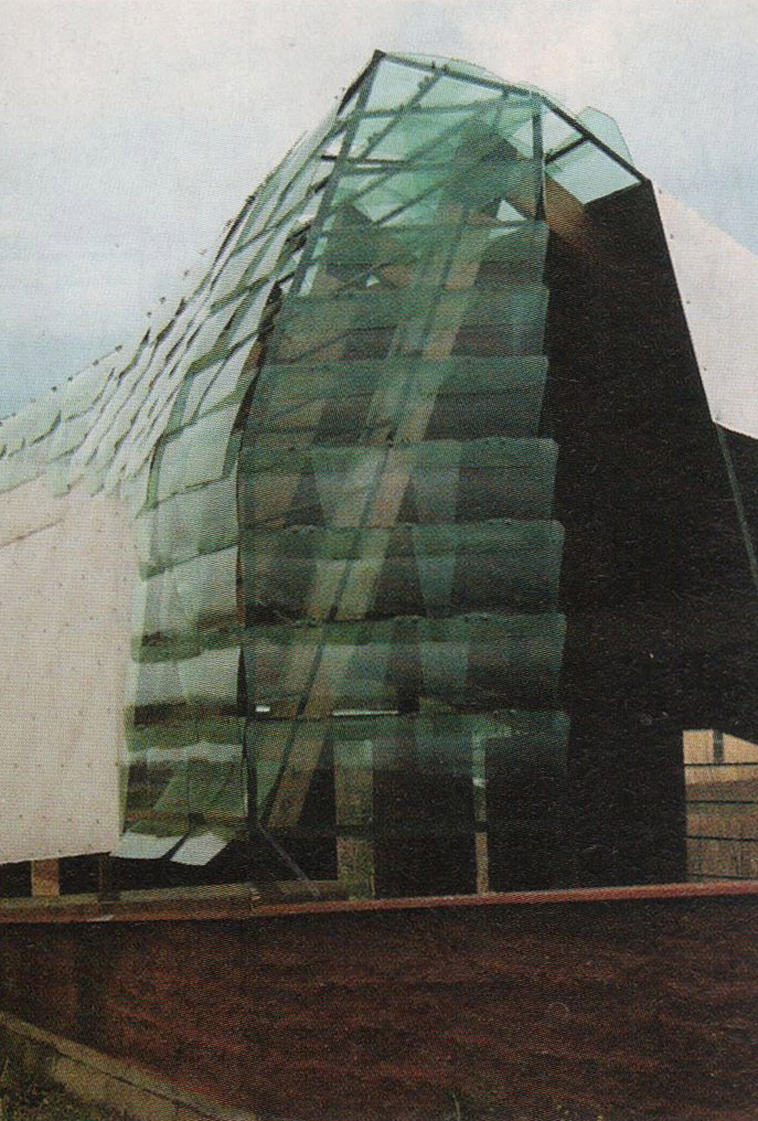 Esterno della sala di lettura comunitaria della casa Mason Bend, con la facciata realizzata con i vetri delle macchine montati a scaglie. Studenti: F. Fulton, A. Gerndt, D. Rush, J. Schumann 2000.