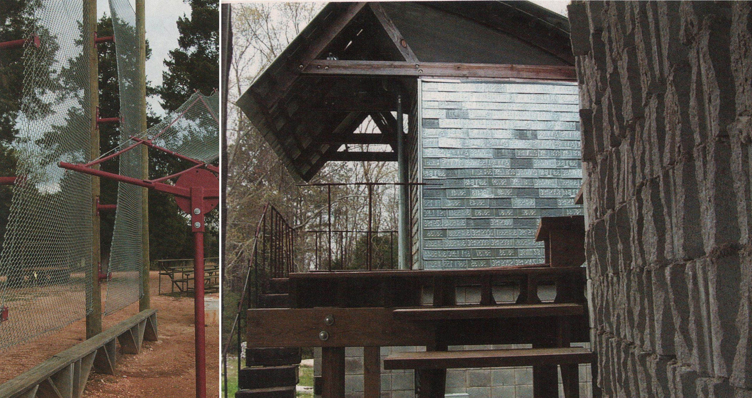A sinistra, il Newbern Baseball Club.  Studenti: J. Sanders, M. Bettridge, J. Kirkpatrick, anno 2001. A destra, in primo piano la casa sperimentale degli studenti con blocchetti scartati montati  di taglio, sullo sfondo la casa foderata da targhe automobilistiche. B. Bottwell, A. Ledetter, M. Vernie 1999.