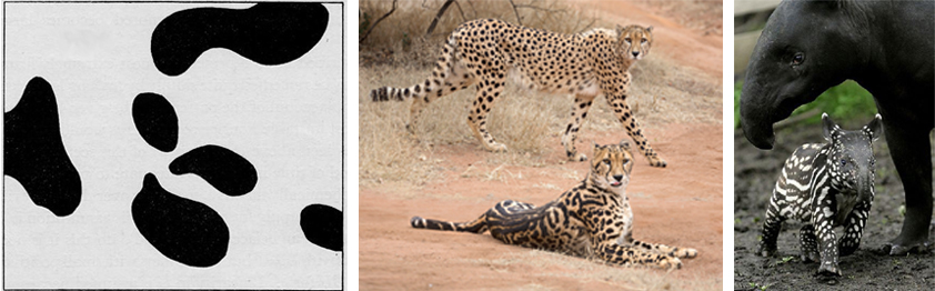 Figura 4. Il modello matematico di Turing descrive il modo in cui le cellule pigmentate si auto-organizzano per creare i pattern del manto degli animali.