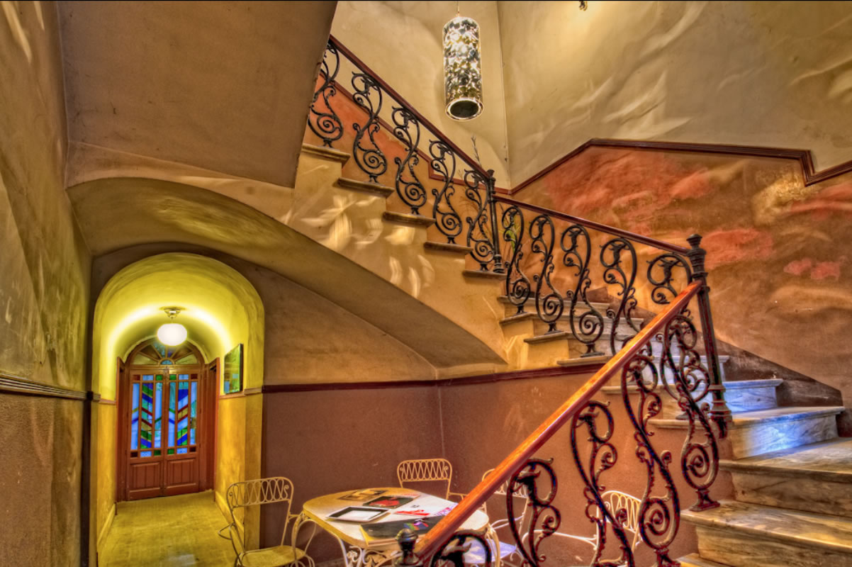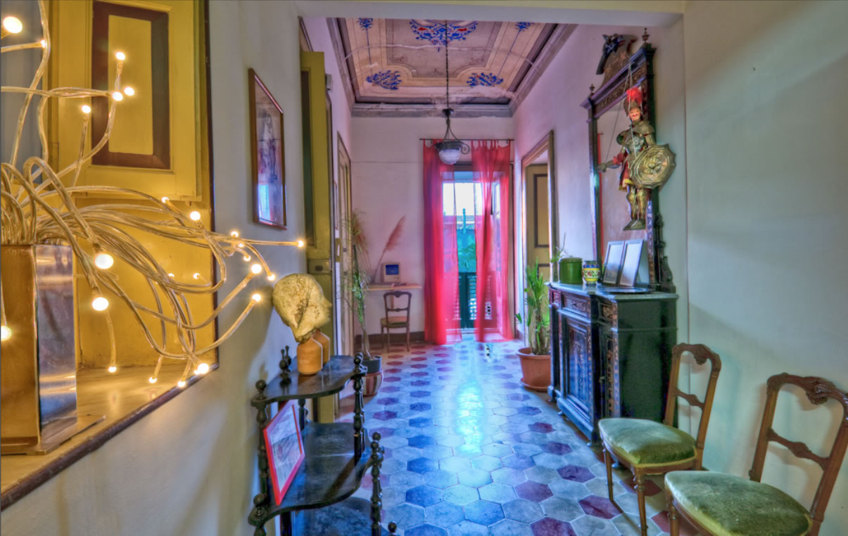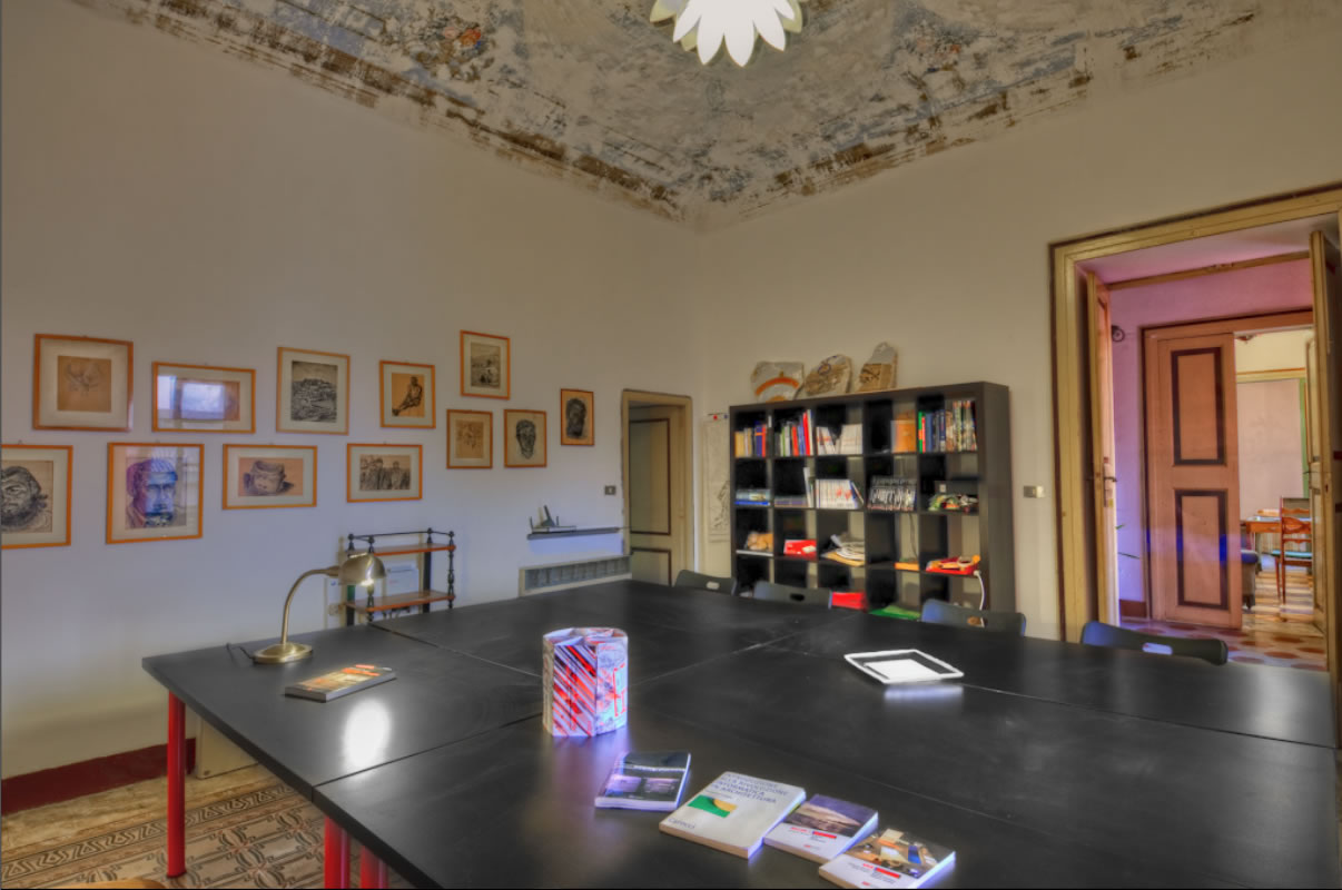 Si accede alla casa dalla strada che tuttora riveste il ruolo di ‘corso’ del paese. Una lunga galleria voltata, al piano terra, connette il corso con un giardino Siciliano, che è più del raddoppio dello spazio occupato dall’edificio. Se non si accede al giardino, si trova uno scalone che conduce al piano nobile, dove secondo un’organizzazione ad anello, diversi ambienti si articolano intorno al vuoto del corpo scala. Tali ambienti, dalle funzioni dedicate allo scambio e alla trasmissione di conoscenza, hanno tutti un nome preciso: ‘Navigation Room’, ‘Tic,Tac& Toc Room’, ecc., poiché è proprio l’avere un nome che crea una rappresentazione condivisa e un riconoscimento dei luoghi nei quali accadranno delle storie, per certi versi addirittura epiche, come dovrebbe sempre verificarsi nei processi educativi. I nomi delle stanze, infatti, costituiscono un pattern che non è solo architettonico ma soprattutto comportamentale.