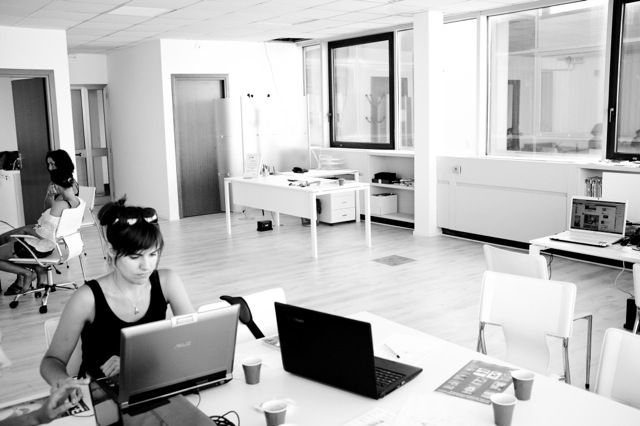 La condivisione è l’arma più importante senza la quale nulla può funzionare. Per questo la sede di via Romiti è un open space. Uno spazio dove chi sta lavorando può sempre guardarsi negli occhi, farsi un cenno, vivere insieme anche nei momenti in cui si stanno svolgendo mansioni diverse.