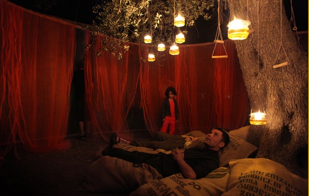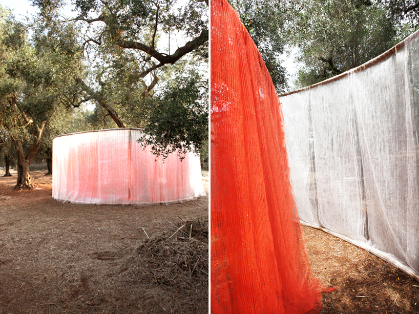 Le reti per la raccolta delle olive, i sacchi di juta e i fili di nylon sono i tre elementi con cui è realizzato questo suggestivo rifugio, concepito per la meditazione e la contemplazione della natura. Il progetto lascia inoltre emergere il carattere stagionale e multifunzionale dell’agricoltura, infatti, le reti vengono riutilizzate nei mesi autunnali per la raccolta pubblica di olive nell’ambito del progetto Lampa!.