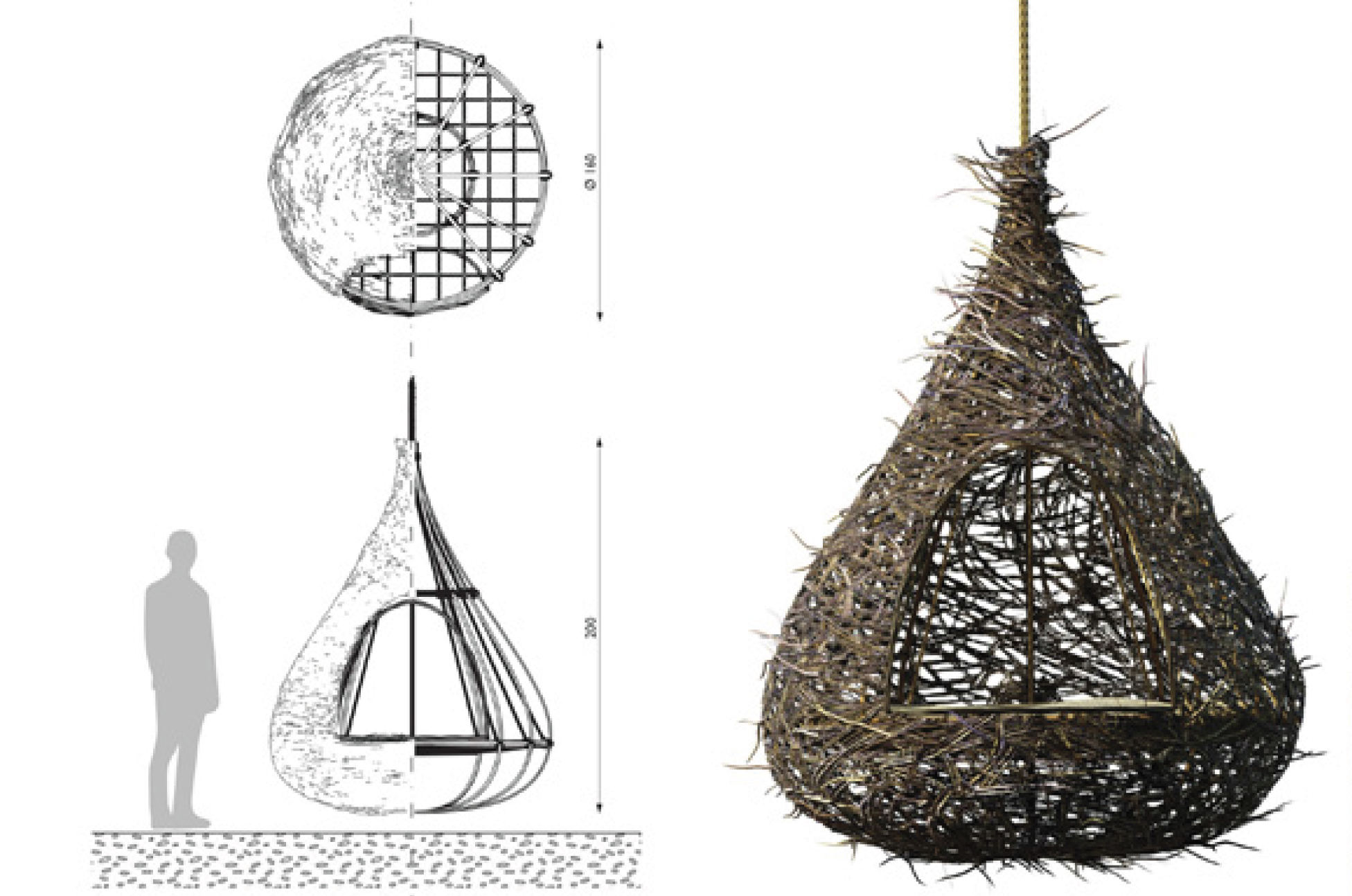 Il progetto Il Nido dei Paduli (secondo classificato) avvolge idealmente l’albero, ponendosi quasi come un’eccezionalità della natura stessa. Costruito all’interno dell’uliveto pubblico, e realizzato con la tecnica dell’intreccio della canna comune che assicura alla struttura leggerezza e trasparenza, il progetto integra l’elemento arboreo in una dimensione onirica e contemplativa del paesaggio, disegnando uno spazio temporaneo accogliente e circolare, etereo e luminoso, ottenuto attraverso l’utilizzo di materiali di riciclo impiegati nell’olivicoltura.