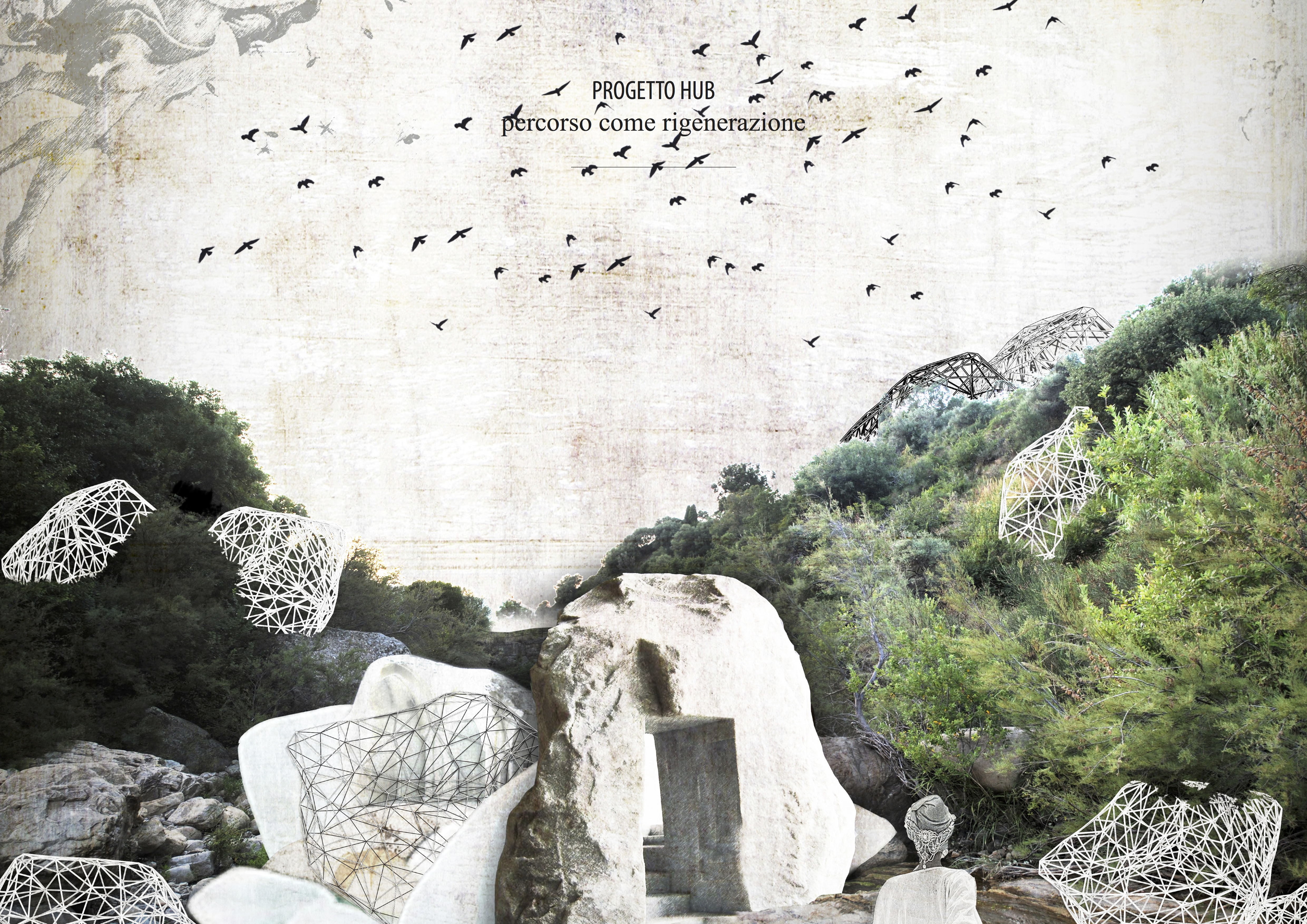 Knowmade Academy. Conoscere e rigenerare Fiumara d’arte tra visibile e invisibile a partire da “Stanza della Barca d’Oro” propone di collegare questa opera così emblematica con la Piramide e la scultura di Consagra e la città di Halaesa con un percorso di rigenerazione che è centrato sulla celebrazione della Madre terra e del Padre cielo. Questi percorsi si basano sia sulla l’esperienza del solstizio d’estate presso la Piramide al 38 parallelo che su altre esperienze e percorsi simili in Europa. Il percorso è puntualizzato da una serie di “bozzoli” – cocoon in inglese – la cui presenza è stata evocata dallo stesso Presti e che hanno varie forme e funzioni. Sono realizzati in materiali naturali, in modalità di autocostruzione, in cicli ecologici che coinvolgono la natura e gli stessi animali. In questo spirito la realizzazione e progettazione dei cocoon possono costituire un elemento originale ed interessante di una serie di prototipi sperimentali che trasformi l’esperienza di Fiumara d’arte in una vero laboratorio di educazione per permanente: la KnowmadeAkademy. I cocoon lungo i percorsi hanno anche funzioni pratiche (ristoro, riparo, raccolta di acqua). Nel sito del progetto la necessità di regolare e proteggere l’alveo del torrente Romei viene affrontata con una serie di grandi coocon realizzati in un cemento che evoca la pietra. Le pietre sono cave e possono anche creare camere di meditazione con luce zentale ed essere oggetto di performance sonore sia tradizionali che attraverso semplici tecnologie informatiche.