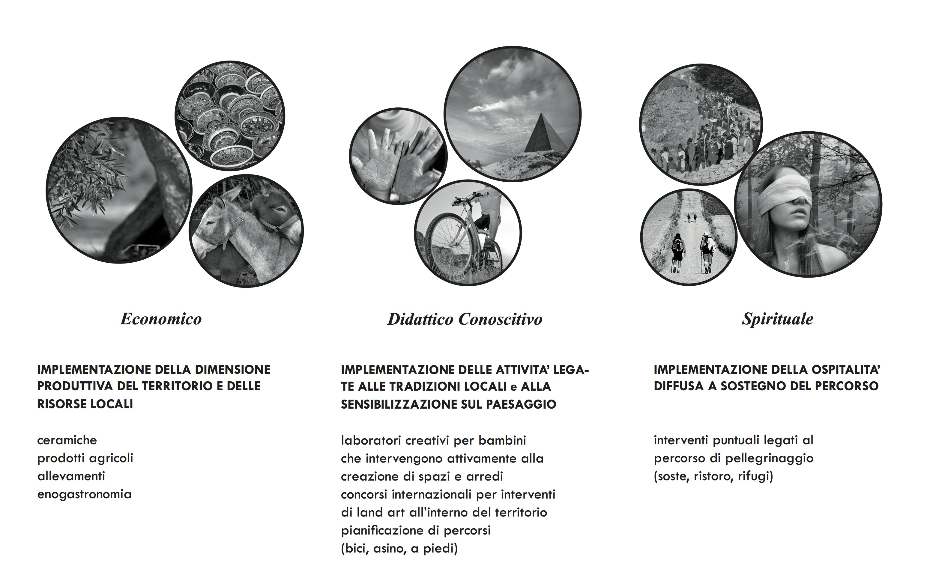 Ciascuno dei tre progetti genera così un anello che a partire dall’opera principale individua altre opere della Fiumara che come pulegge avvolgono le reti che lo formano. Arethusa, Muro della Vita, Labirinto di Arianna per Terra; La Materia poteva non esserci e Piramide per Cielo; l’Atelier sul mare, la Piramide e Energia mediterranea per Acqua. Ma l’anello si aggancia anche a risorse del territorio innanzitutto dal punto di vista storico culturale, (nei diversi casi il Museo della ceramica a Santo Stefano il percorso sulla scogliera a Cefalù, la antica città di Halaesa). Accanto alle risorsa culturale ciascun progetto individua anche un’area suscettibile di uno sviluppo economico non solo compatibile al tema, ma che lo esalti. Si individuano in nuove forme di lancio della imprenditoria giovanile la chiave per attuare questa componente nella convinzione che valorizzazione economica del territorio non è in contrasto con la ricerca della bellezza e dell’arte.