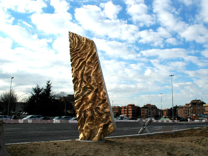 Torniamo ora al presente perché, ricordando la lezione di Rovelli sulle onde gravitazionali, i loro riverberi sono molto lunghi e attraversano lo spazio ma anche il tempo. Sono moltissimi gli artisti e gli architetti che hanno fatto delle tematiche cosmiche dei veri e proprio topos della propria produzione. In particolare credo che sia significativo riflettere sull’opera di Giovanna De Sanctis Ricciardone, un’arch-artista, come lei stessa si definisce. Dopo avere lavorato per vent’anni presso l’associazione culturale “Il politecnico”, Giovanna De Sanctis pratica adesso nel suo studio Progetto-Arte, a Calvi dell’Umbria. L’intero lavoro della scultrice si basa sul concetto di archetipo: secondo la De Sanctis ognuno di noi è portatore di archetipi che persistono aldilà di tutti i rivolgimenti storici e delle letture razionali che si possono dare del mondo. Uno dei suoi personali archetipi è quello che lei stessa definisce Kosmos: il senso primigenio che l’essere umano ha di essere schiacciato da forze cosmiche, ma anche della necessità di comunicare con esse. In questa lettura l’arte, la scultura, l’architettura vedono la propria scena nativa proprio nell’atto di sfida alla gravità: l’azione di sollevare un peso, sottrarlo alla forza di gravità e porlo in posizione verticale è la prima manifestazione di potenza umana, del desiderio di sfuggire alle forze cosmiche, di affrontarle e riunirvisi allo stesso tempo. Per la De Sanctis la scultura è “il luogo di un rito gravitazionale”[5], ed in molte delle sue opere questo rito si compie manifestando la contraddizione tra una forza che ci spinge verso il cielo ed una che ci schiaccia sulla terra. Nella scultura Ofelia, nel quartiere di Decima a Roma, così come nella scultura Stele, sempre a Roma nel quartiere Trionfale, la contraddizione è cristallizzata in un momento che è ci appare in equilibrio, ma labile. Le grandi masse, imponenti, sono disassate rispetto alla verticale, sottratte alla forza di gravità e animate da una forza centrifuga che le proietta nello spazio celeste.