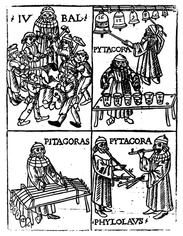 Gaffurius, Theorica musicae – Pitagora studiando l’armonia e la ratio con diversi strumenti musicali, 1492