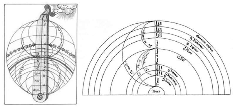 Parallelamente alla teoria pitagorica, Tolomeo sviluppa una visione magico-ermetica di questo concetto: teorizza che la perfezione armonica trovata da Pitagora si rifletta all’interno del cerchio dello Zodiaco. Gli intervalli fondamentali della musica sarebbero cioè, dati dal rapporto tra gli archi sottesi al suo diametro (corrispondente all’intervallo di ottava, cioè 2:1), ai lati del triangolo in esso inscritto (corrispondente alla quinta, 3:2) e del quadrato inscritto (corrispondente alla quarta, 4:3). Sia nella rappresentazione dell’uomo zodiaco che in quella dell’uomo monocordo sono quindi visibili queste occulte simpatie tra l’uomo e il cosmo: l’armonia dei pianeti agisce sul microcosmo esterno e su quello interno dell’uomo racchiuso all’interno della circonferenza. Aristotele, poi, confuta la teoria dell’armonia delle sfere affermando che, se per assurdo esistesse un suono prodotto dalla rotazione degli astri, sarebbe talmente forte ed intenso da distruggere la vita sulla Terra. Sarà poi Simplicio, sempre un aristotelico, a fornire la soluzione a quest’enigma: egli sposta l’attenzione dall’udibilità della musica in sé, allo stato ricettivo in cui si trova l’ascoltatore.
