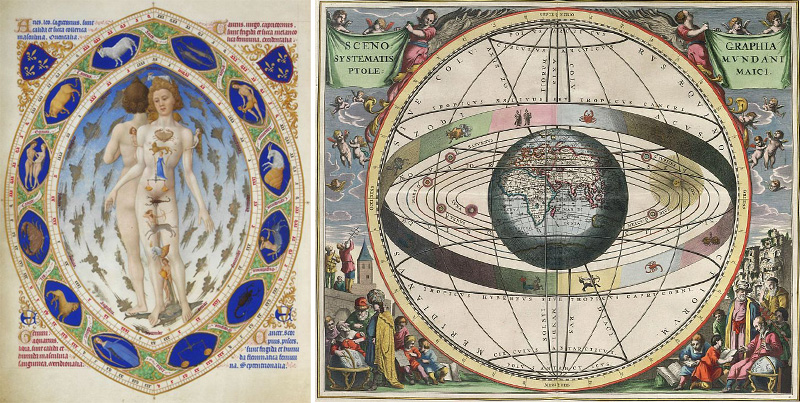 The Très Riches Heures du Duc de Berry, Anatomical man or Zodiac man, tardo XV secolo (courtesy Pinterest), a sinistra. A destra il modello tolemaico e l’armonia delle sfere in un’antica stampa.