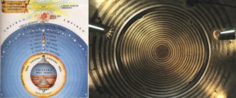 Modello dell’Universo dantesco, a sinistra. A destra, cupola dell’eremo di San Galgan (foto del prof. Antonino Saggio)