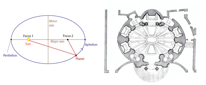 Modello delle nuove orbite ellittiche individuate da Keplero, a sinistra. A destra, pianta di Sant’Andrea al Quirinale di Gian Lorenzo Bernini, 1658