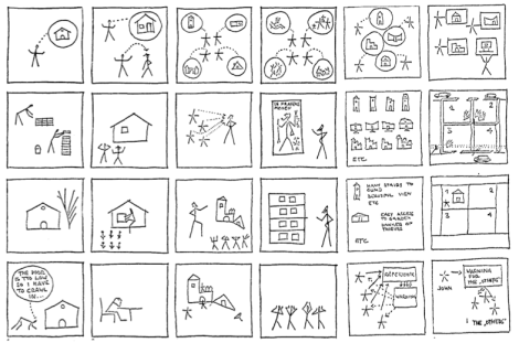 Malgrado la ricerca, la principale innovazione promossa da Yona nell’affrontare un tema tanto complesso e delicato, non risiede nell’utilizzo di particolari materiali da costruzione (riguardo ai quali vi è un’ampia documentazione raccolta ed elaborata insieme al collega Shauer, soprattutto in merito all’uso del bambù come materiale da costruzione), ma nello strumento utilizzato dall’architetto, ovvero i propri disegni. Non si tratta di elaborati tecnici, ma di fumetti, vignette composte da linee semplici e stilizzate e per questo di immediata comprensione. <<Nella storia dell’architettura , lo strumento è sempre stato l’elemento fondamentale di rapporto con la materia della costruzione>>[3]. Friedman, nel doversi confrontare con analfabeti, trova nelle sue illustrazioni un mezzo semplice e chiaro per la comunicazione, specialmente all’interno di una società audiovisiva come quella del secondo dopoguerra, dove era necessario sfruttare la potenza dell’immagine, che si imponeva fortemente a quella della parola.