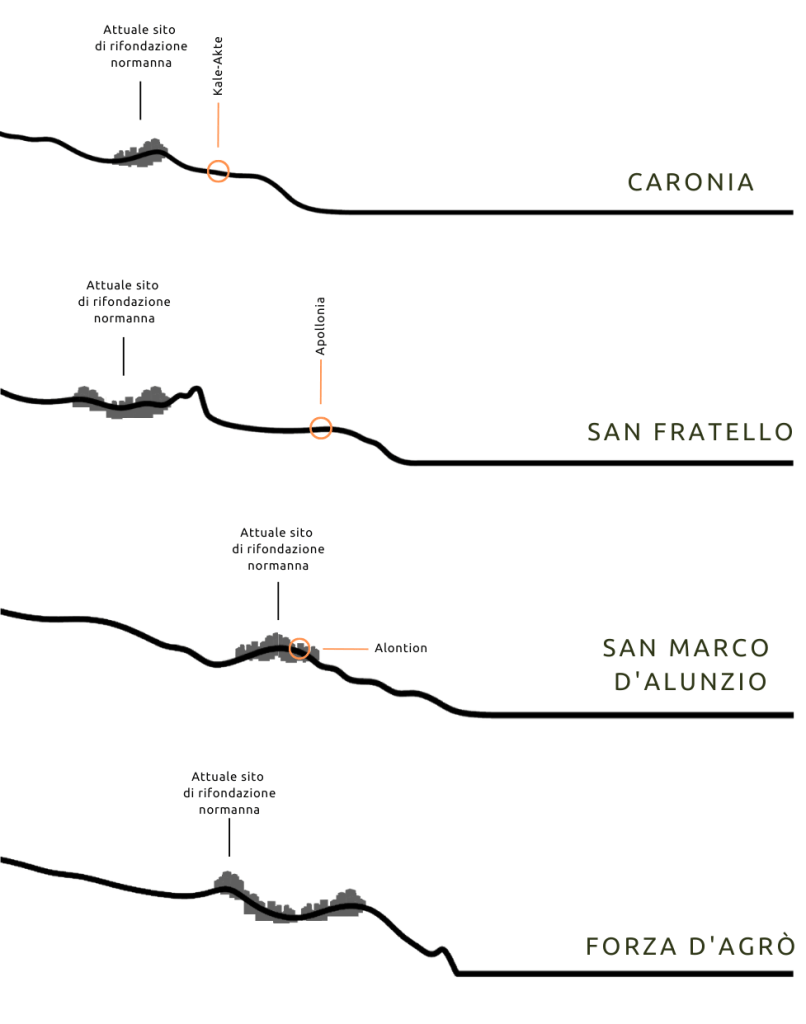 Nell’area in esame, diversi nuclei della fascia sub costiera, in particolare Caronia, San Fratello, San Marco D’Alunzio e Forza d’Agrò, presentano caratteri comuni, nel quadro delle trasformazioni descritte. In particolare una fondazione di epoca normanna, su promontori in corrispondenza delle testate di crinale, in prossimità dei siti attivi in epoca greca.