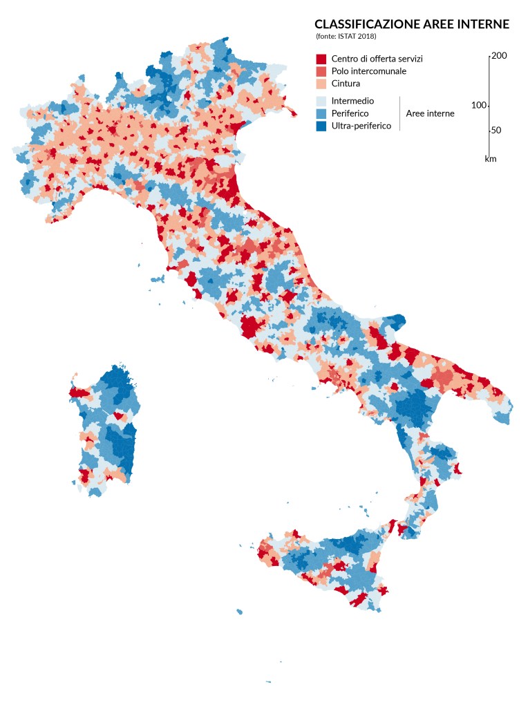 In questo contesto, il documento SNAI oltre a fornire opportuni strumenti per la comprensione e classificazione delle aree interne (considerando la quantità e accessibilità dei servizi ad esse dedicati; la presenza di stazioni ferroviarie limitrofe e il soddisfacimento dell’offerta scolastica secondaria) prevede l’attuazione di due livelli di intervento: in primo luogo, il rafforzamento dei servizi pubblici essenziali, le cosiddette precondizioni di sviluppo, atte a garantire la crescita economica delle suddette aree e considerate diritti fondamentali dei cittadini. In secondo luogo, la promozione di progetti di sviluppo locale che possano essere volani per l’attrazione di nuovi capitali verso questi territori dimenticati. Quello che però manca nelle linee guida, e non caso il progetto non è mai decollato, è una riflessione basata sulla convinzione che senza infrastruttura non c’è sviluppo, per poi comprendere che tipo di infrastruttura sia necessaria affinché ciò avvenga.