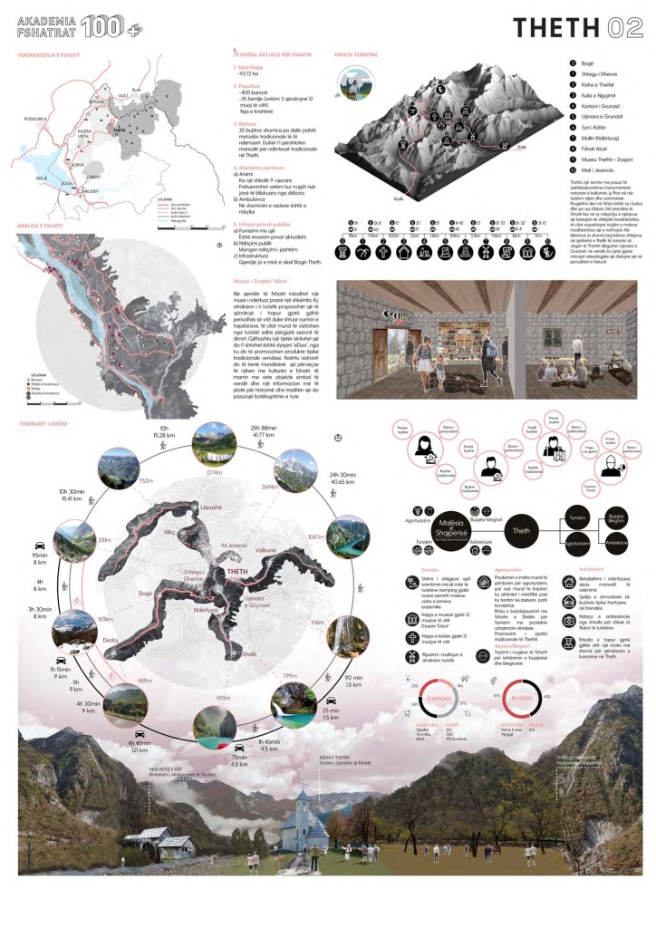 Chi scrive, ha preso parte (come membro di uno dei team afferenti alla POLIS University di Tirana [2]) nel 2018-2019 al progetto Akademia 100+ Fshatrat (Accademia 100+ Villaggi), un’iniziativa di Spatial planning del governo albanese, avviata dall’ufficio del primo ministro e attuato dall’Agenzia nazionale per la pianificazione territoriale (AKPT), in stretta collaborazione con il Ministero dell’agricoltura e dello sviluppo rurale (MADR), il Ministero del turismo e dell’ambiente (MTM), il Ministero della Cultura (MK), il Ministero delle Infrastrutture e dell’Energia (MIE), l’Agenzia per lo Sviluppo Fondo per lo sviluppo agricolo e rurale (ADDF) e Fondo per lo sviluppo albanese (DFDF). Questa iniziativa nasce in attuazione di Il Programma Nazionale di Sviluppo Rurale “100 Borghi” con l’obiettivo principale di progettare i modelli sviluppo per ciascuno di essi, in base al potenziale turistico. 22 gruppi di villaggi sono stati studiati da altrettanti gruppi di lavorolche si sono occupati della progettazione dei modelli di sviluppo più consono a ciascuno. Ognuno dei 22 team di lavoro ha previsto nella sua composizione: cinque studenti, un capogruppo con lo status di docente, un assistente di gruppo e un grafico (part-time). Le squadre sono stato supportate anche da studenti della Facoltà di Economia/UT e studenti di Università di Agraria di Tirana durante il lavoro sul campo e a Tirana. La strategia ha previsto non solo la progettazione su scala territoriale, ma anche l’individuazione di abitazioni e edifici con pregio architettonico, abitazioni abbandonate con potenzialità trasformazione, elementi di spazi condivisi da poter trasformare in spazi della comunità attraenti per i visitatori, edifici abbandonati con potenzialità per divenire un hub di sviluppo, percorsi storici nella natura in grado di collegare punti di interesse per il turista, la possibilità di creare itinerari turistici giornalieri, e di identificare aspetti di valore per te sviluppato nell’ambito del turismo rurale. La fase di lavoro ha richiesto un metodo ibrido basato su tre momenti fondamentali e differenti strumenti di lavoro: una serie di interviste sul campo con gli abitanti e i loro rappresentati basate su questionari forniti come base dal governo e dai suoi rappresentati; delle missioni alla ricerca degli oggetti di valore architettonico presenti sul territorio e sul confine con il Montenegro. Il progetto (fig. 3-4) è stato un lavoro di progettazione caratterizzato da una forte connessione tra mondo universitario e politico terminato a Tirana con una presentazione di fronte al Primo Ministro Edi Rama tra il dicembre 2018 e il gennaio 2019.