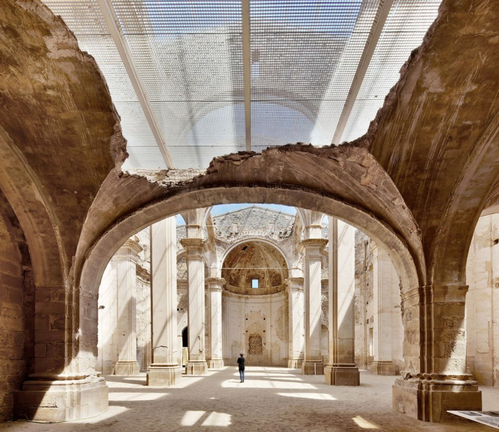 Questa memoria sofferta, incorporata nella massa e nella pelle di queste poderose strutture, trasmette all’osservatore un messaggio civile e una lezione sul passato. Ora la luce penetra dall’alto e genera un paesaggio in cui la materia comunica la sua melanconia e lo strazio della sua vicenda. Lo spazio interno, nella scelta della copertura trasparente, protegge la spazialità della chiesa, violata dalla guerra civile. Questa condizione viene salvaguardata a memoria futura. Le volte crollate mostrano, al contempo, nuove spazialità e tutto comunica una tensione tra la massa e le ossature. Il progetto celebra la dimensione intima e consunta della materia, che non solo ha attraversato il tempo, ma nel tramutarsi in rovina, a causa di forze esterne, rivela la sua vera essenza.